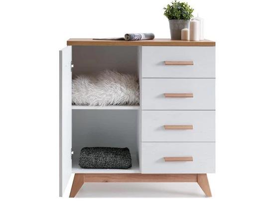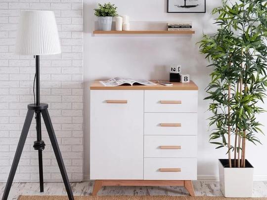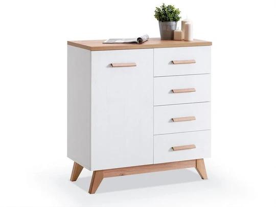 Komoda má štyri šuplíky a jednou policou vnútri. Je vyrobená z kvalitnej laminovanej dosky LTD, vďaka ktoré je odolná voči poškriabaniu, oderom, blednutie a krátkodobému pôsobeniu vody. Je opatrená hranou ABS, ktorá zabraňuje možnému poškodeniu. Vysoké nôžky skrine a úchytky sú vyrobené z masívneho dreva.