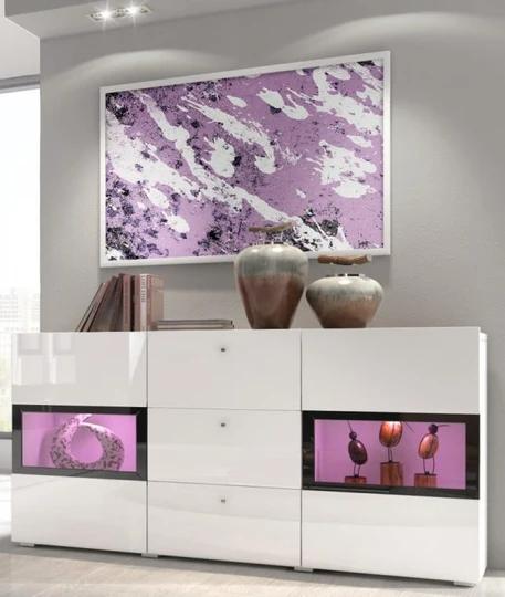 Komoda je vyrobená z kvalitnej laminovanej drevotriesky a tvrdeného skla. Pre podčiarknutie elegancia možno do komody dokúpiť aj farebné LED osvetlenie. Ak vám nevyhovuje toto farebné prevedenie, pozrite si komodu aj v ďalších farebných variantoch.