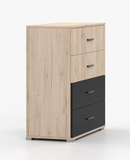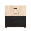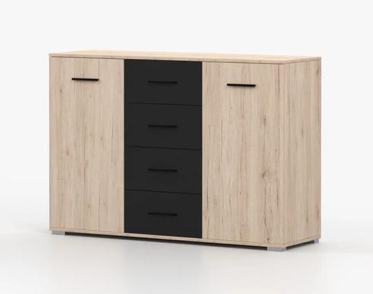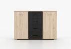 Zostava do spálne Libera predstavuje štýlové a praktické riešenie pre moderne zariadený interiér. Elegantná kombinácia dekoru svetlého dubu San Remo s kontrastnými čiernymi prvkami dodáva zostave výrazný charakter a zároveň vytvára útulnú atmosféru ideálnu na každodenný oddych.