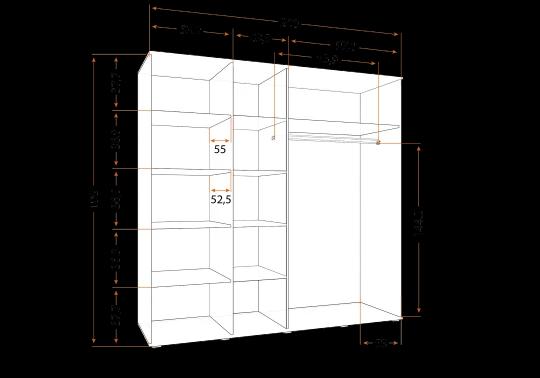 Dominantou zostavy je priestranná šatníková skriňa so zrkadlom, ktorá vďaka svojej veľkej kapacite ponúka dostatok miesta na prehľadné uloženie oblečenia. Vo vnútri sa nachádzajú hlboké police aj šatníková tyč na ramienka, čo umožňuje jednoduchú organizáciu. Praktický systém posuvných dverí šetrí miesto v miestnosti a zabezpečuje pohodlné používanie. Zrkadlová plocha navyše opticky zväčšuje priestor a presvetľuje interiér.