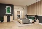 Súčasťou spálne je aj manželská posteľ s ložnou plochou 160 × 200 cm, ktorá poskytuje komfortné zázemie pre kvalitný spánok. Dekoratívne čalúnené čelo postele zvyšuje pohodlie pri relaxe a zároveň podčiarkuje moderný vzhľad celej zostavy.