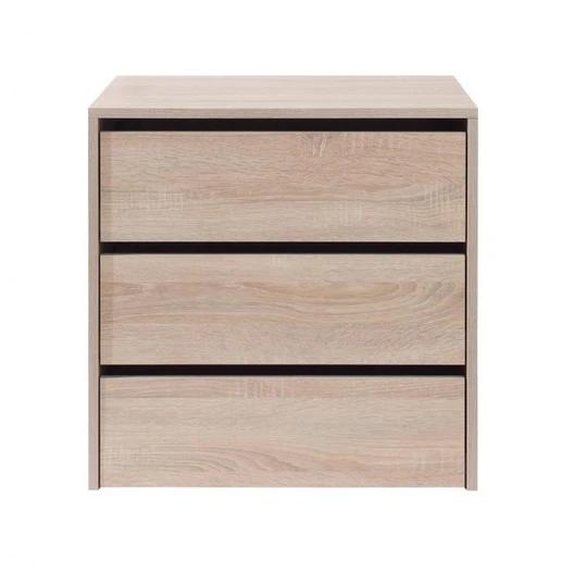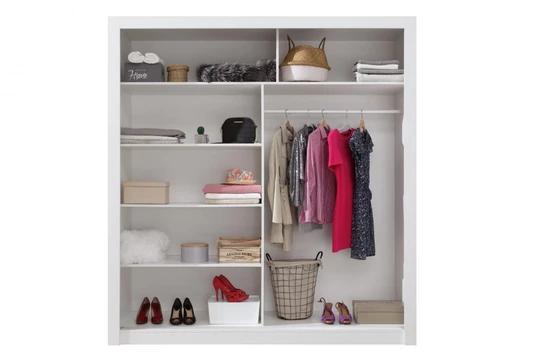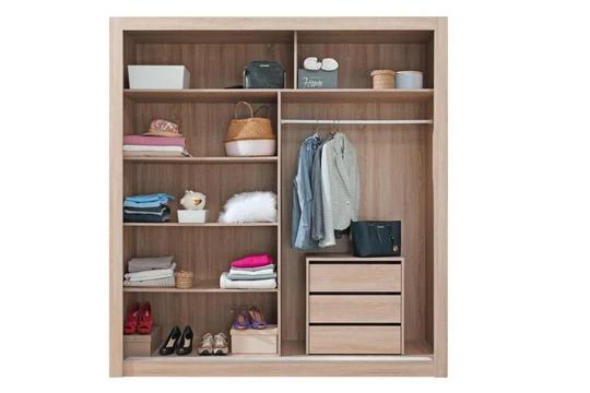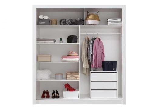 Skriňa je vybavená posuvnými dverami, ktoré umožňujú ľahké otváranie aj v menších priestoroch. Pre ešte lepšiu organizáciu je možné do skrine zakúpiť doplnkový kontajner s tromi zásuvkami, ktorý poskytne extra úložný priestor na drobnosti a doplnky.