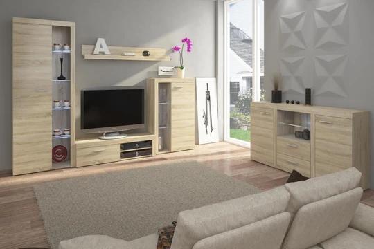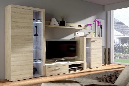 Obývacia stena sa skladá z televízneho stolíku, dvoch vitrín a police. V prípade potreby úložného priestoru navyše možné dokúpiť tiež príslušná komoda. Nábytok je vyrobený z kvalitného lamina, ktoré je veľmi odolné voči mechanickému poškodeniu (pr. poškriabanie), vlhkosti a nepodlieha času.