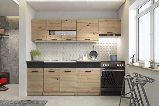Je zložená z niekoľkých druhov skriniek, vďaka ktorým budete mať dostatok úložného priestoru na všetky kuchynské potreby. So svojimi rozmermi perfektne zapadne aj do menších interiérov. Pracovná doska má hrubosť 28 mm. Váha kuchyňa je 148,8 kg.
