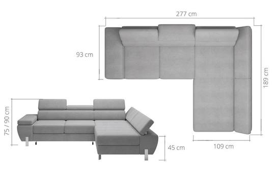 Moderná sedacia súprava s funkciou rozkladu a možnosťou následného spánku o ploche 141x217 cm. Súčasťou sedačky je aj úložný priestor, regulovateľné záhlavníky a opierka laktov.