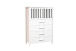 Atraktívna vysoká komoda CROISTY je vybavená štyrmi zásuvkami a dvoma dvierkami.