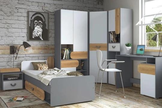 Nábytku dominuje šedý korpus doplnený vpredu bielym dekorom v kombinácii s hrživým drevom duba.