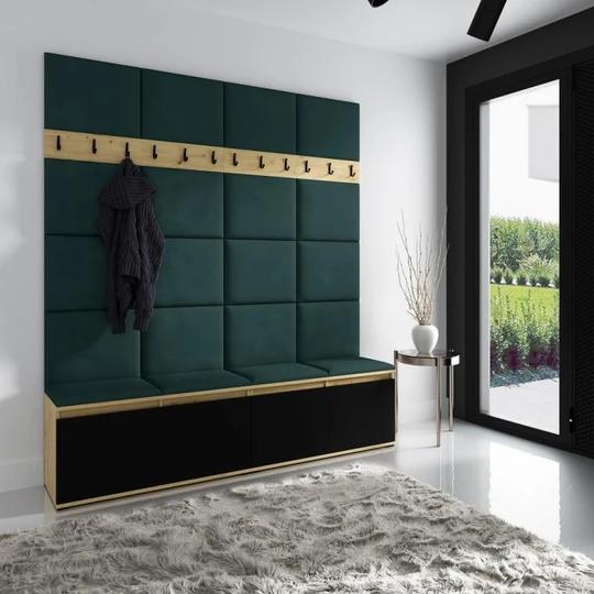 Tiež to poznáte? Otvorte hlavné dvere domu a na zemi sa váľa plno pohodených topánok, tašiek, sem tam aj nejaké to oblečenie? S týmto už je koniec. S našou elegantnou predsieňovou stenou DIAMOND 4 budete mať všetko krásne uložené a navyše rozarí Vašu chodbu a dodá jej pocit útulnosti. Nábytok je vyrobený z kvalitného lamina o hrúbke 1,6 cm, ktorý je odolný proti poškriabaniu, vlhkosti a vysokým teplotám. Navyše je nenáročný na údržbu. Hrany sú z PVC materiálu. Predsieňová stena poskytuje priestor pre zavesenie kabátov, búnd či iných odevov, ale aj pre topánky. Najviac oceníte ale miesto na sedenie, ktoré Vám umožní ľahšie obúvanie. Stena sa pýši svojimi modernými a hlavne aj farebnými čalúnenými panelmi, ktoré sú v poslednej dobe veľkým trendom. Sú vyrobené zo zamatovo hladkej látky. Na výber máte až niekoľko odtieňov. Zostava sa skladá z botníkov, vešiakov a panelov.