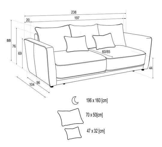 Konštrukcia je tvorená borovicovým drevom, drevotrieskou a MDF s HDF doskou. V sedáku sú pružiny faliste typu B, sendvičová výplň PUR pena T28/30. V opornej časti sú pružiny faliste typu A a PUR pena T28/30. Vankúše sú vyplnené penou.