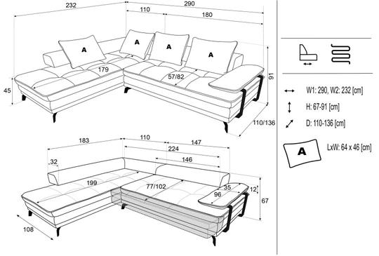 Sedák je možné vysunúť až do dĺžky 110 cm. V zloženom stave má hĺbku 65 cm (s vankúšmi), 88 cm (bez vankúšov). Vďaka tomu bude odpočinok pri televízii skutočným luxusom.