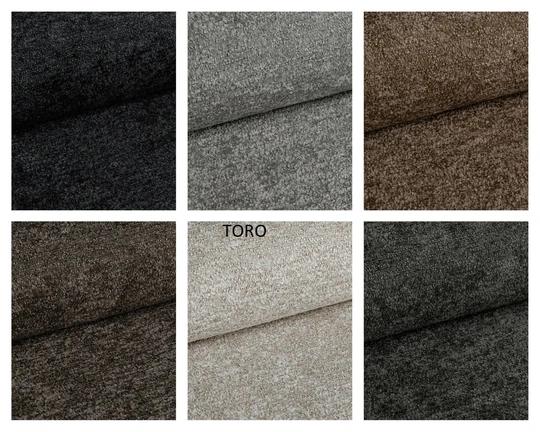 TORO je látka kombinujúca bouclé a chenilovú priadzu. Flexibilná, univerzálna a elegantná. Zložením ide o 100 % polyester s vysokou gramážou 400 g/m². V teste odolnosti voči oderu dosahuje 80 000 cyklov, čo ju radí medzi odolné látky. Nehorľavá.
