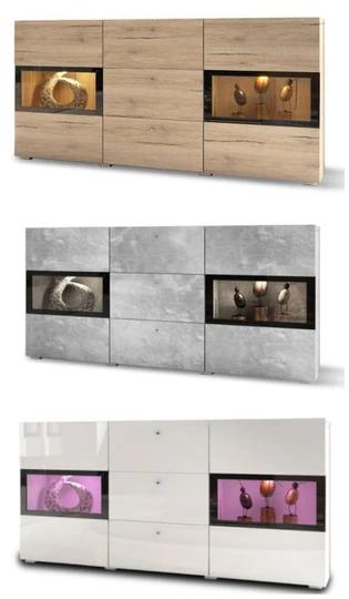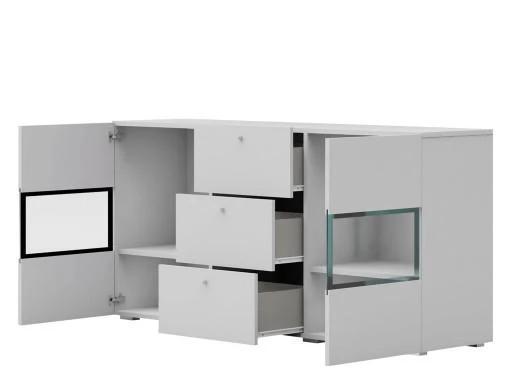 Komoda je vyrobená z kvalitnej laminovanej drevotriesky a tvrdeného skla. Pre podčiarknutie elegancia možno do komody dokúpiť aj farebné LED osvetlenie. Ak vám nevyhovuje toto farebné prevedenie, pozrite si komodu aj v ďalších farebných variantoch.