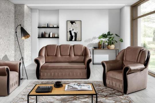 Skladá sa z trojpohovky a dvoch kresiel, ktoré poskytnú skvelú oporu pre vaše unavené telo. Trojpohovka je rozkladací a ponúka štedrý úložný priestor na všetko, čo práve nemá byť na očiach. Zadná časť pohovky a kresiel je čalúnená.