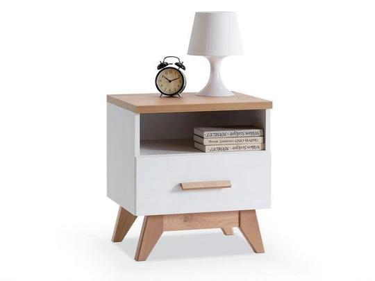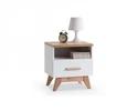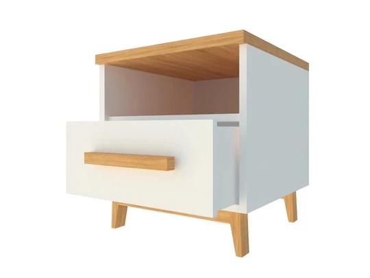 Nočný stolík disponuje voľným úložným priestorom a zásuvkou. Je vyrobený z kvalitnej laminovanej dosky LTD, vďaka ktoré je odolný voči poškriabaniu, oderom, blednutie a krátkodobému pôsobeniu vody. Je opatrený tiež hranou ABS, ktorá zabraňuje možnému poškodeniu. Vysoké nôžky stolíku a úchytky sú vyrobené z masívneho dreva.