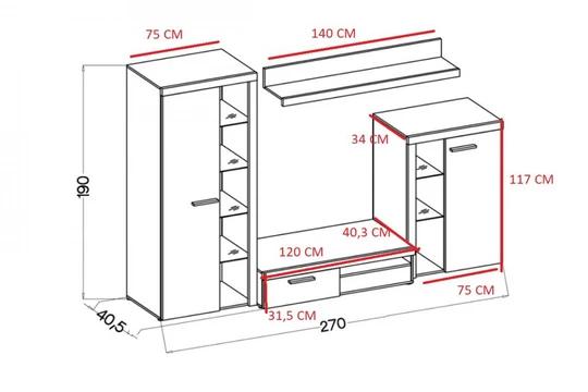 Obývacia stena sa skladá z televízneho stolíku, dvoch vitrín a police. V prípade potreby úložného priestoru navyše možné dokúpiť tiež príslušná komoda. Nábytok je vyrobený z kvalitného lamina, ktoré je veľmi odolné voči mechanickému poškodeniu (pr. poškriabanie), vlhkosti a nepodlieha času.
