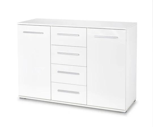 Systém nábytku River je vyrobený z laminovanej dosky v kombinácii s vysokým leskom. Pri čisto bielom dekore je nábytok vykonaný v bielom lesku. Hrany sú opatrené ABS.