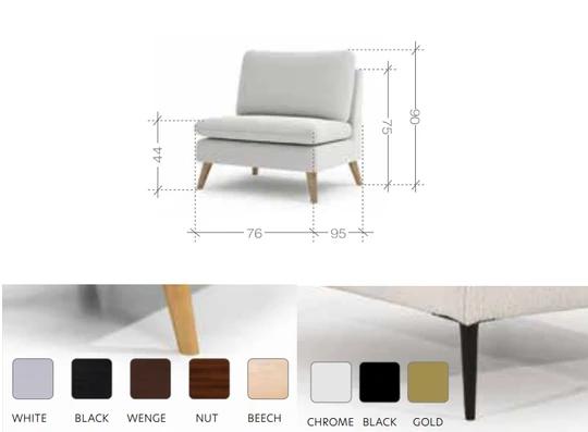 Drevené nôžky s výškou 14 cm sú dostupné v piatich dekóroch: čierna, biela, wenge, orech a buk (farbu prosím uveďte do poznámky k objednávke). Pokiaľ preferujete kovové nôžky, pozrite sa na naše kreslo TODI.