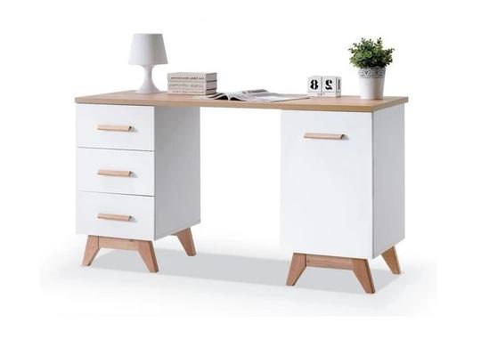 Priestranná pracovná doska poskytuje dostatok miesta pre notebook, monitor aj dokumenty, zatiaľ čo premyslené úložné riešenie pomáha udržať pracovné miesto prehľadné a organizované. Na jednej strane sa nachádza trojica priestranných zásuviek, ideálnych na uloženie kancelárskych potrieb či drobností. Druhú časť tvorí uzatvárateľná skrinka s policou, vhodná napríklad na šanóny, knihy alebo techniku.