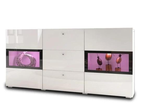 Komoda je vyrobená z kvalitnej laminovanej drevotriesky a tvrdeného skla. Pre podčiarknutie elegancia možno do komody dokúpiť aj farebné LED osvetlenie. Ak vám nevyhovuje toto farebné prevedenie, pozrite si komodu aj v ďalších farebných variantoch.