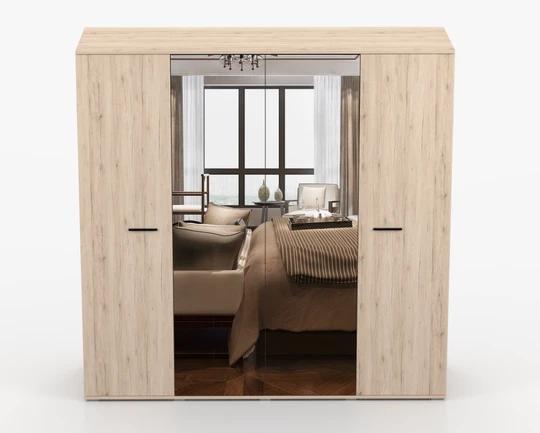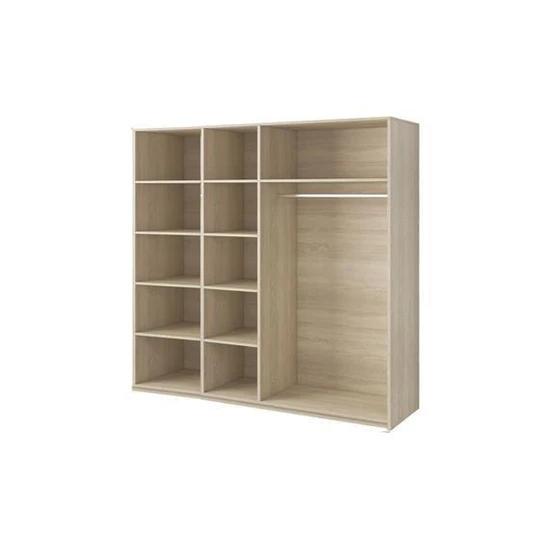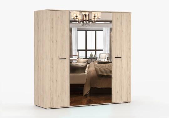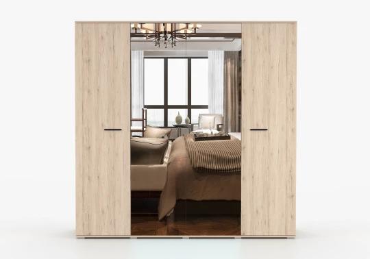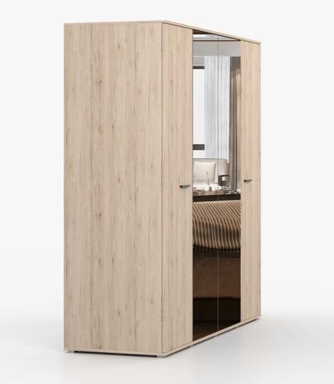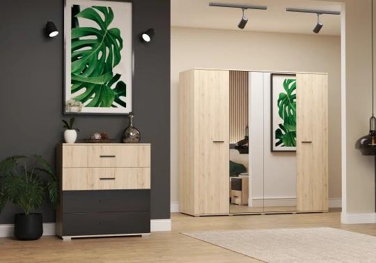 Dominantou zostavy je priestranná šatníková skriňa so zrkadlom, ktorá vďaka svojej veľkej kapacite ponúka dostatok miesta na prehľadné uloženie oblečenia. Vo vnútri sa nachádzajú hlboké police aj šatníková tyč na ramienka, čo umožňuje jednoduchú organizáciu. Praktický systém posuvných dverí šetrí miesto v miestnosti a zabezpečuje pohodlné používanie. Zrkadlová plocha navyše opticky zväčšuje priestor a presvetľuje interiér.