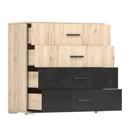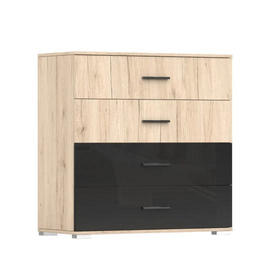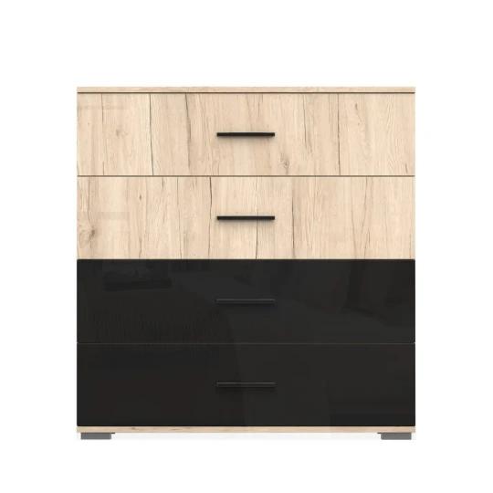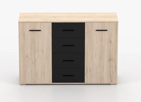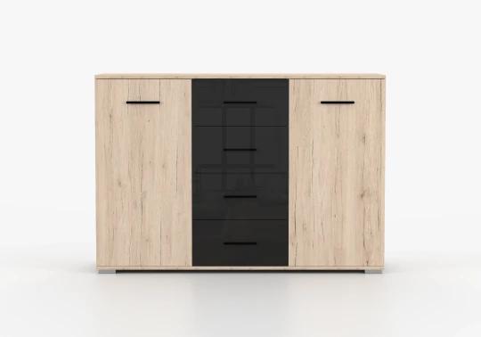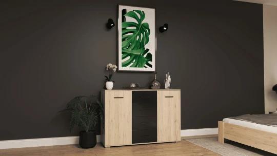 Zostava do spálne Libera predstavuje štýlové a praktické riešenie pre moderne zariadený interiér. Elegantná kombinácia dekoru svetlého dubu San Remo s kontrastnými čiernymi prvkami dodáva zostave výrazný charakter a zároveň vytvára útulnú atmosféru ideálnu na každodenný oddych.