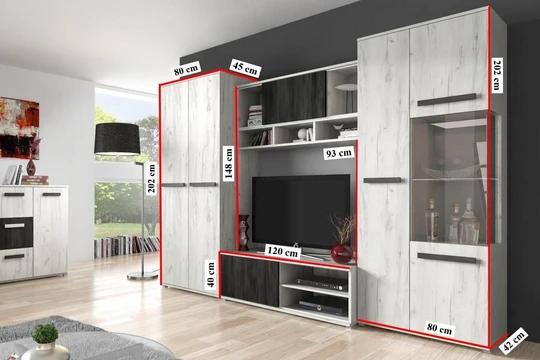 Obývacia zostava West si získa srdcia predovšetkým obdivovateľov moderného štýlu, ktorí si potrpia na spojenie elegancie s praktickosťou. Skladá sa z televízneho stolíka, komody a vitríny.