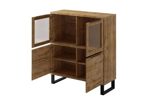 Zostava na pohľad pôsobí masívnym dojmom, ale je vyrovená z kvalitnej laminovanej dosky, ktorá je funkčná vďaka svojej odolnosti a jednoduchej údržbe. Úchytky skrine sú kovové.