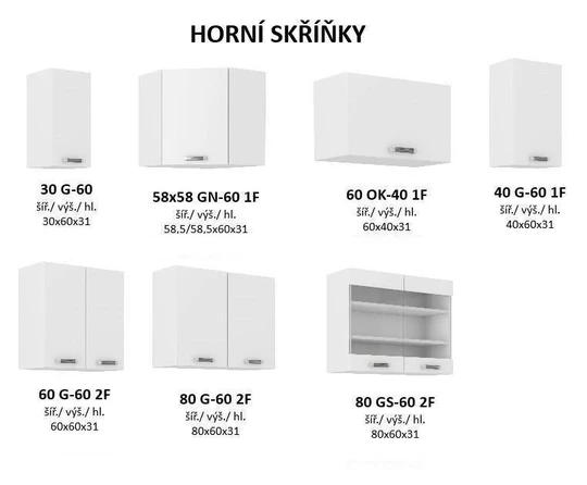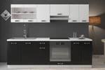 Kuchyňa je vyrábaná v dekore biely korpus a šedý lesk na dvierkach. Pracovná doska nie je v cene, ale je možné ju zakúpiť v dekore biela, hrubosť 28 mm.