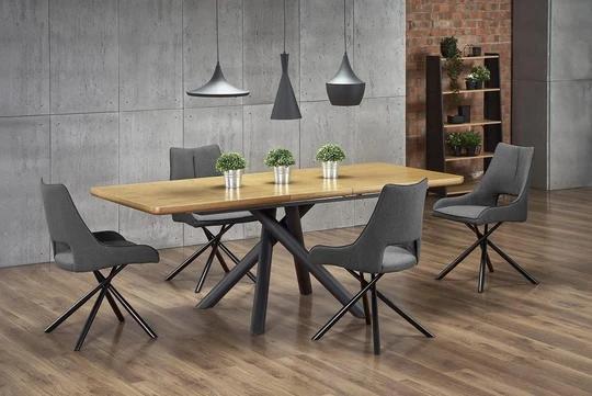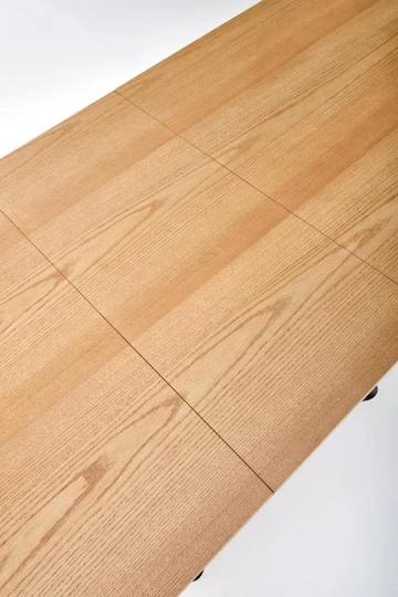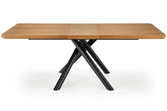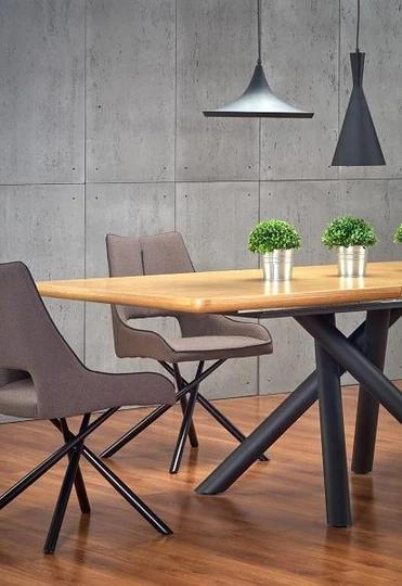 Jedálenský stôl je vyrobený z MDF, prírodné dosky a stojí na čierno lakovaných oceľových nôh. Má klasický obdĺžnikový tvar a ponúka priestor minimálne pre štyri až šesť ľudí. Navyše je rozkladací, takže nakŕmite viac hladných krkov naraz.