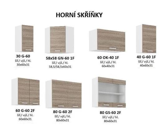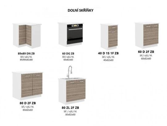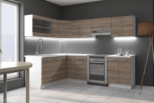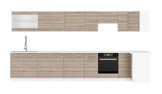 Kuchyňa je vyrábaná v dekore biela / dub sonoma trufel. Pracovná doska nie je v cene, ale je možné ju zakúpiť v dekore biela, hrubosť 28 mm.