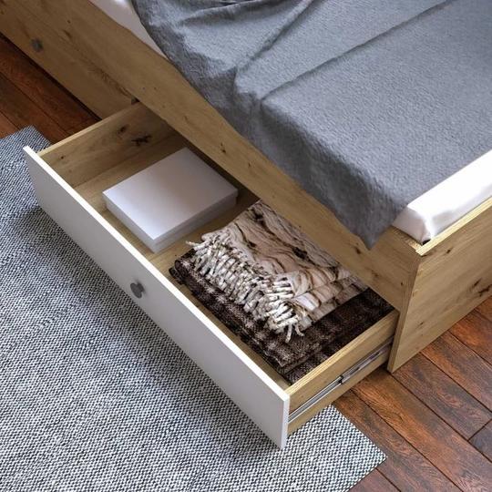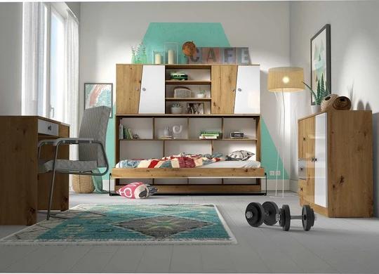 Súčasťou je praktická výklopná posteľ. Posteľ bude skvelým riešením, keď sa stretávate s nedostatkom priestoru. Vo dne vyzerá ako moderné skriňa, v noci ju však môžete využiť k plnohodnotnému spánku.