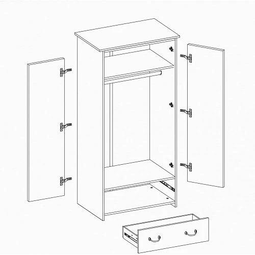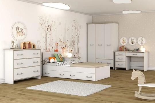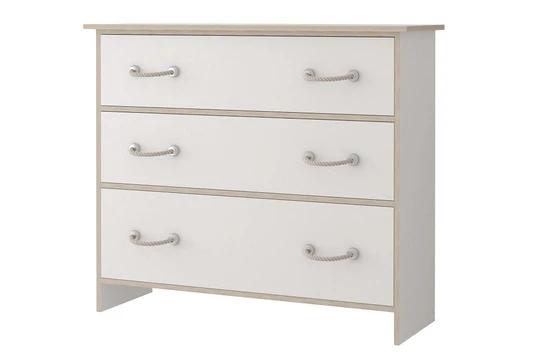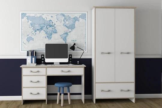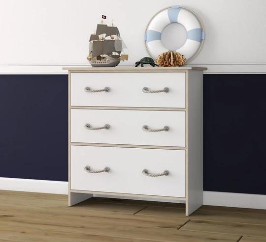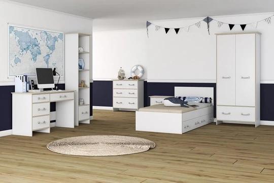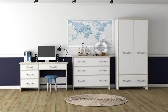 Zostava obsahuje skrine, regál a komody rôznych veľkostí. Nechýba ani písací stôl a dokonca tu nájdete aj posteľ 90x200 cm s roštom. Nábytok je moderný, funkčný a priestranný. Rukoväte sú v dizajne námorníckeho lana.