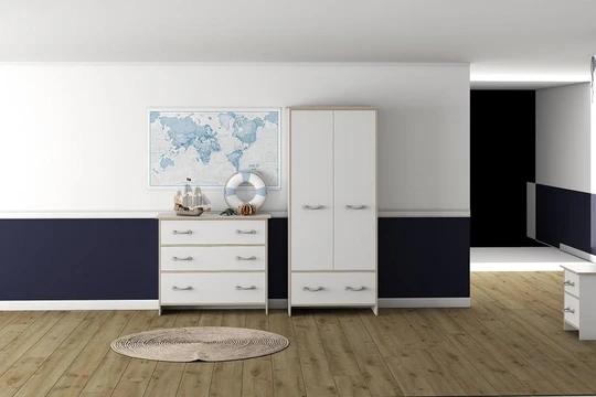 Nábytok je moderný, funkčný a priestranný. Rukoväte sú v dizajne námorníckeho lana.