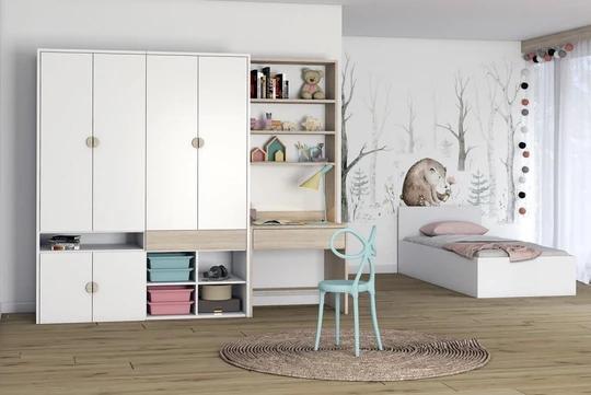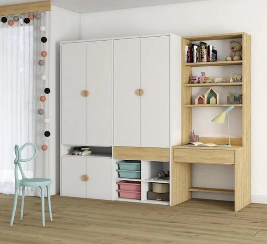 Dekor dreva biela a dub hikora skvele zapadne do aktuálnych trendov. Každý kus nábytku je samostatný modul, takže si nábytok môžete usporiadať v ľubovoľnej kombinácii. Zostava je zložená z dvoch skríň a modulu so stolom. V jednej skrini je šatníková tyč a regál. Druhá skriňa obsahuje police a skrinku.