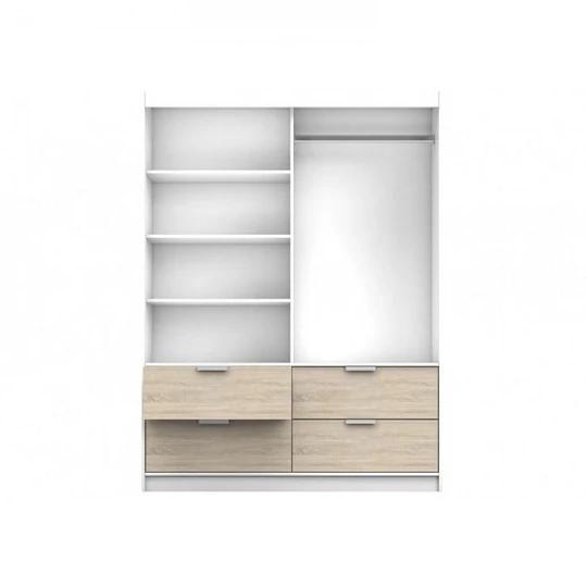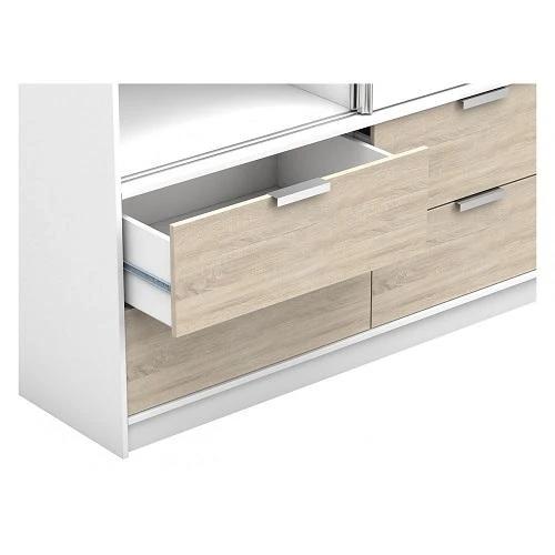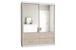 Margita je moderná skriňa s posuvnými dverami. Svojím dizajnom a neutrálnym dekorom sa hodí takmer do každého interiéru. Vďaka posuvným dverám vám skriňa nezaberá miesto navyše. Skriňa je rozdelená na dve časti, vybavená niekoľkými policami, šatníkovou tyčou av spodnej časti 4 priestrannými šuplíkmi. Zrkadlo vám pomôže vychytať posledné detaily pri obliekaní.