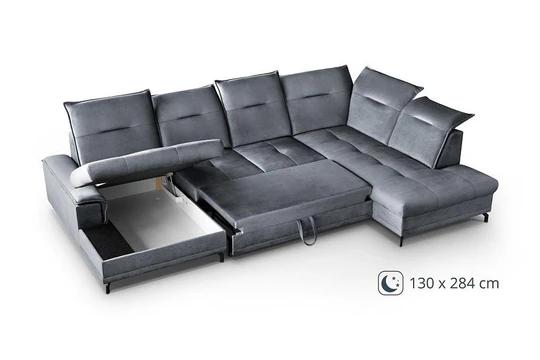 Sedačka disponuje rozkladom a aj úložným priestorom o veľkosti 130x284 cm. Systém rozkladanie je typu "DELFÍN" - matrac ich vysunie zo spodnej časti sedačky za úchytku. Po vysunutí sa zdvíha ťahaním do výšky sedacej časti. Výhodou sú polohovateľné opierky hlavy a nadštandardne aj nastaviteľná hĺbka sedenia. Vďaka opierkam môžete prispôsobiť komfort sedenia Vašim potrebám.