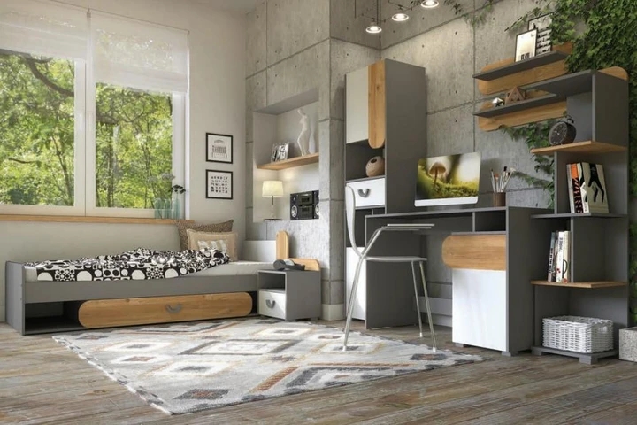 Nábytku dominuje šedý korpus doplnený vpredu bielym dekorom v kombinácii s hrživým drevom duba. Zostava obsahuje posteľ s roštom 80x195 cm, šatníkovú skriňu, niekoľko vitrín, regál, komodu, police, písací stôl a nočný stolík.