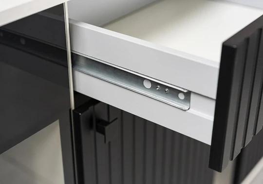 Ozdobné lamely na predných dvierkach dodávajú nábytku veľkolepý efekt. Okraje sú chránené odolným melamínom.