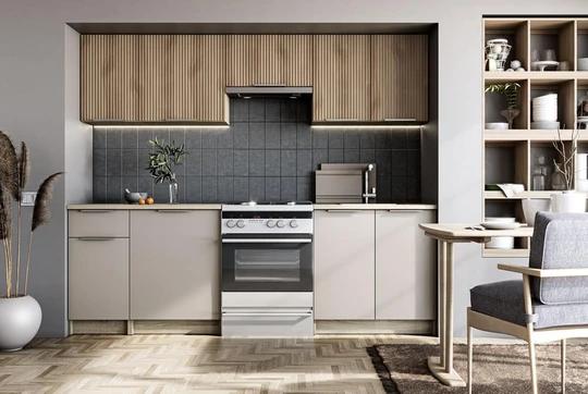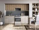 Moderná kuchynská zostava sa skladá z horných skriniek vo farbe orecha s dizajnovými drážkami a spodných skriniek vo svetlo šedom odtieni. Pracovná doska (hrúbka 28mm) v dekore dub sonoma harmonicky dopĺňa celkový dojem kuchyne.