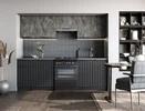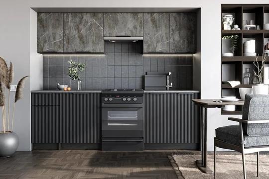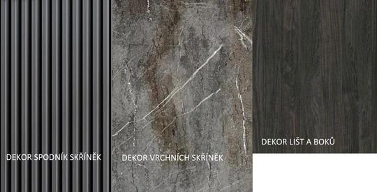 Moderná kuchynská zostava sa skladá z horných skriniek vo farbe šedého mramoru a spodných skriniek v čiernej farbe s designovými drážkami. Pracovná doska (hrúbka 28mm) v šedom dekore harmonicky dopĺňa celkový dojem kuchyne.