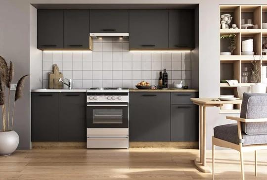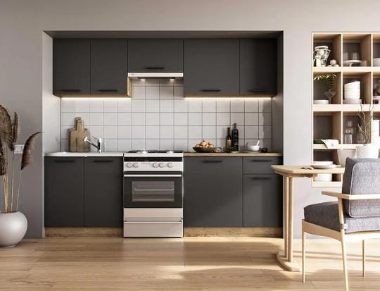 Moderná kuchynská zostava sa skladá z horných a spodných skriniek v antracitovej farbe (dvierka) a dekoru dub craft (korpus). Pracovná doska (hrúbka 28mm) taktiež v dekore dub craft harmonicky dopĺňa celkový dojem kuchyne.