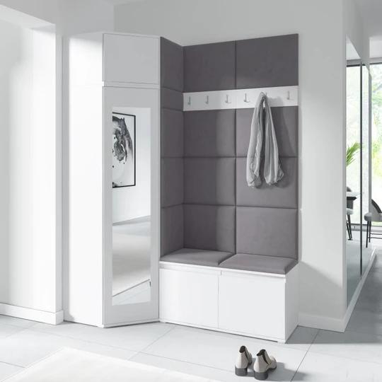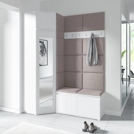 Predsieňová stena poskytuje priestor pre zavesenie kabátov, búnd či iných odevov, ale aj pre topánky. Najviac oceníte ale miesto na sedenie, ktoré Vám umožní ľahšie obúvanie. Stena sa pýši svojimi modernými a hlavne aj farebnými čalúnenými panelmi, ktoré sú v poslednej dobe veľkým trendom. Sú vyrobené zo zamatovo hladkej látky. Na výber máte až niekoľko odtieňov. Zostava sa skladá z botníku, vešiaku a panelov.