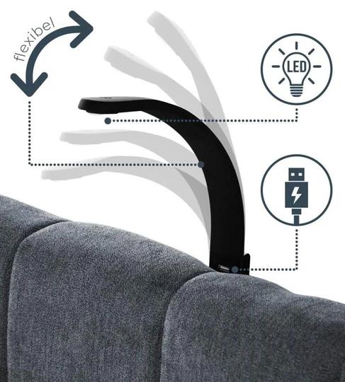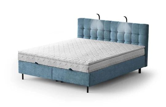 Posteľ má navyše úložný priestor, ktorý sa otvára za pomoci plynových piestov. Jej súčasťou sú aj dve kovové lampy v čiernej farbe s možnosťou regulácie. Osvetlenie je vo svetlej farbe. Nabíja sa cez USB.
