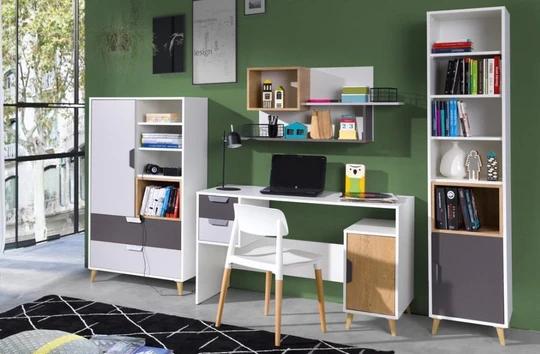 Zostava obsahuje skriňu, regál. Nechýbajú ani police a dokonca tu nájdete aj písací stôl so skrinkou. Nábytok ponúka štedrý úložný priestor, ktorý pojme ako učebnice, tak aj osobné poklady.