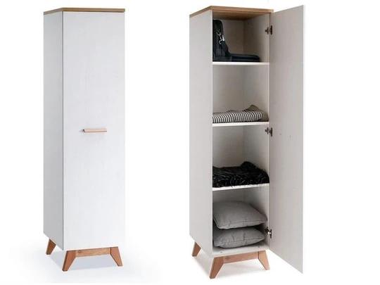 Skriňa má jedny dvere, za ktorými sa nachádzajú 3 police. Je vyrobená z kvalitnej laminovanej dosky LTD, vďaka ktorému je odolná voči poškriabaniu, oderom, vyblednutiu a krátkodobému pôsobeniu vody. Je opatrené tiež hranou ABS, ktorá zabraňuje možnému poškodeniu. Vysoké nôžky skrine a úchytky sú vyrobené z masívneho dreva.