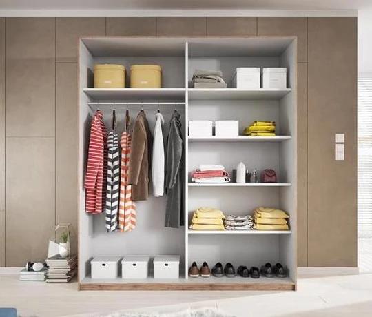 Vnútro šatníkovej skrine je rozdelené na dva priestory – policová časť a časť so šatníkovou tyčou. Je vybavená posuvnými dverami, ktoré umožňujú úsporu miesta, čo určite ocenia majitelia malých bytov.