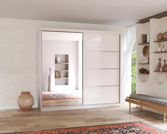 Veľká posuvná skriňa disponuje štedrým úložným priestorom, ktorý ocenia predovšetkým poctivo nakupujúci ženy. Vnútri sa nachádza niekoľko praktických políc a šatníková tyčZrkadlo vám pomôže vychytať posledné detaily pri obliekaní.