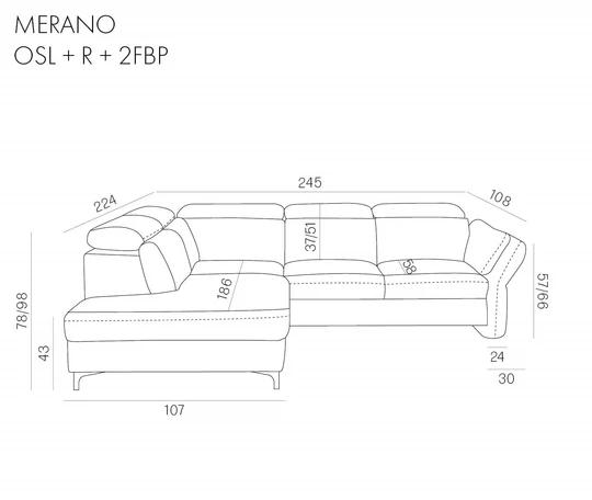 Sedacia súprava Merano má na výber aj stranu rohovej časti ľavá (diely OSL + R + 2FBP) x pravá (diely 2FBL+ R + OSP). Dekoratívne vankúšiky na fotografiách nie sú súčasťou vybavenia sedacej súpravy.